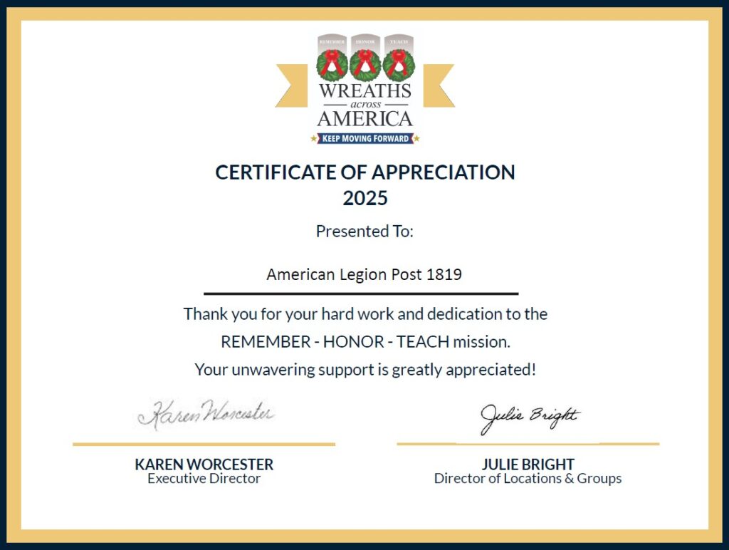We received a Certificate of Appreciation from Wreaths Across America for our 2025 support. Below is the letter from the Executive Director Karen Worcester: